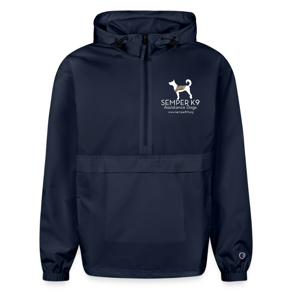 Featuring the official Semper K9 logo, this sleek, wind- and water-resistant jacket is perfect for early morning walks, race days, travel, volunteering, or everyday wear. With a half-zip hood, adjustable cords, and a hidden pouch pocket, it delivers comfort and function without sacrificing style. Best of all, it packs neatly into its own pocket, making it an ideal companion wherever your day takes you.